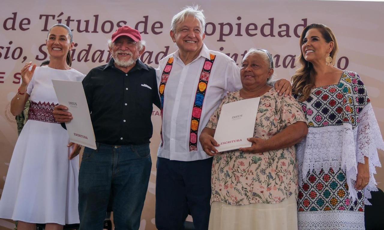 Playa del Carmen.- El presidente Andrés Manuel López Obrador, la presidenta electa Claudia Sheinbaum y la gobernadora Mara Lezama Espinosa entregaron hoy los primeros mil 774 títulos de propiedad, de un total de 3 mil 913 lotes, a habitantes de la colonia Colosio, en un acto histórico que culmina con una larga etapa de incertidumbre y desesperanza y que cumple con la palabra presidencial de resolver este problema.
