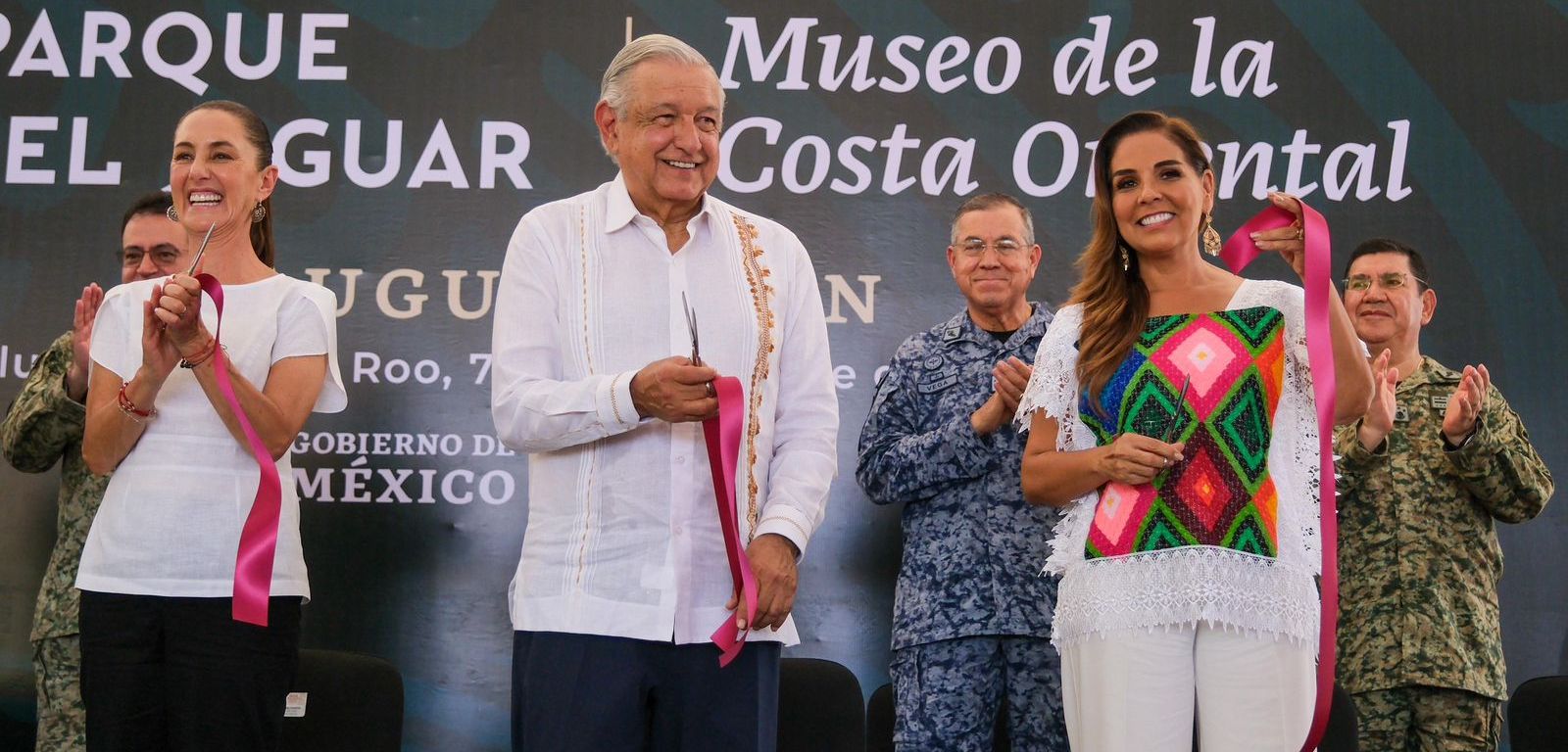 El presidente Andrés Manuel López Obrador y su sucesora, Claudia Sheinbaum inauguraron el Parque del Jaguar y el Museo de la Costa Oriental, un proyecto asociado al Tren Maya que conjuga la protección ambiental, la recuperación del patrimonio histórico y reivindica a la civilización Maya. “Este museo es de los más bellos. Cuando lo visiten van a ver que cosa tan bella, uno de los mejores museos de México por el trabajo de arqueólogos y arqueólogas, los restauradores”, dijo el presidente Andrés Manuel López Obrador.