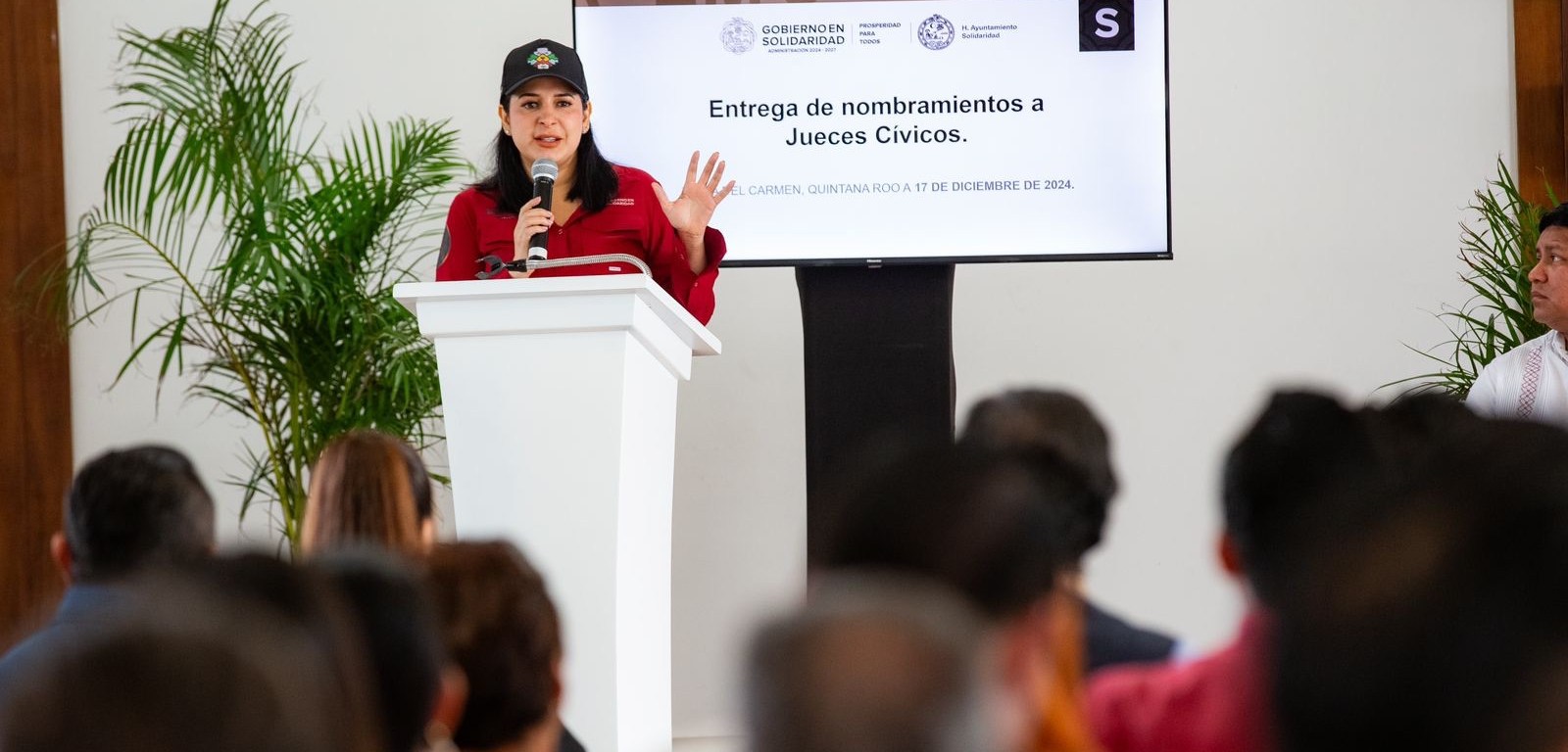 Playa del Carmen, Quintana Roo, 17 de diciembre de 2024.— La Justicia Cívica es la herramienta clave para prevenir conflictos, fortalecer el tejido social y construir un Solidaridad más justo y ordenado, dijo la presidenta municipal Estefanía Mercado, en la entrega de siete nombramientos a juezas y jueces cívicos, en el salón “Leona Vicario”, en el nuevo Palacio Municipal.