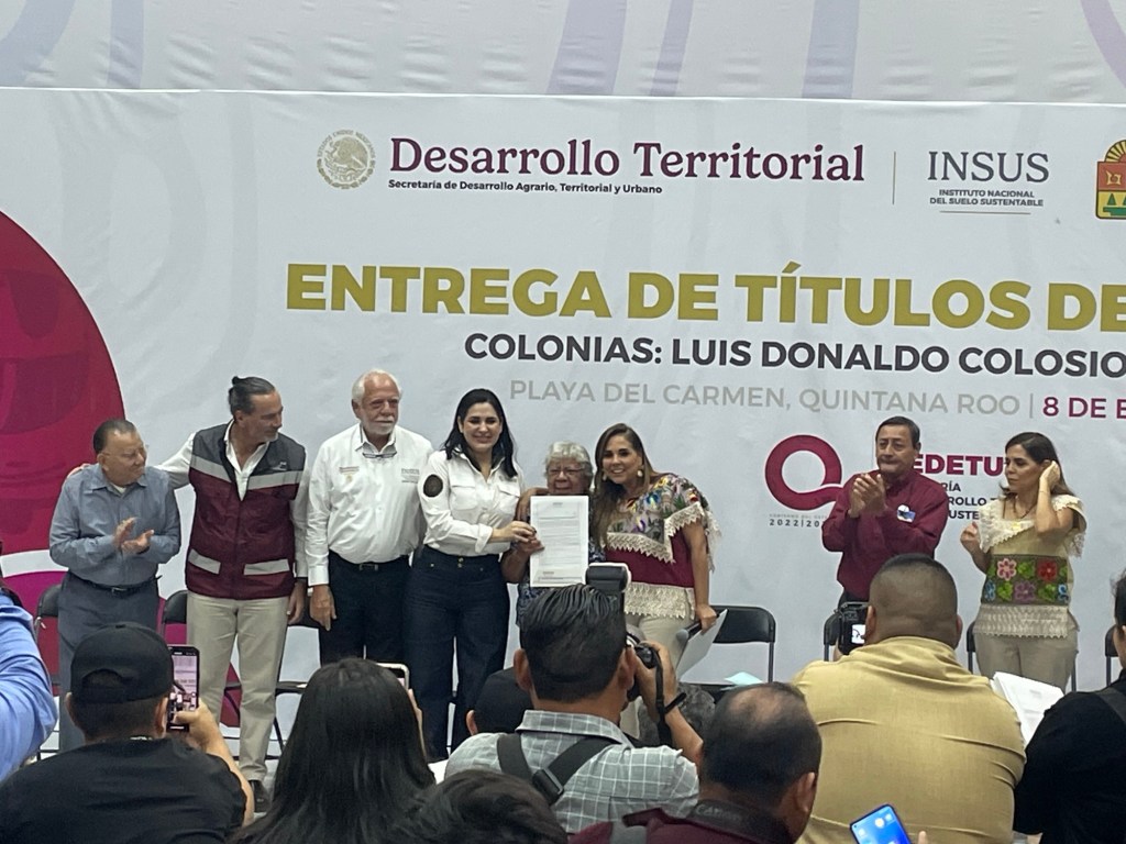 En el marco de la ceremonia para la entrega de títulos de propiedad de las colonias Colosio y Cristo Rey del aún municipio de Solidaridad, la presidenta municipal Estefanía Mercado Asencio acompañó a la Gobernadora Mara Lezama y a las autoridades federales.