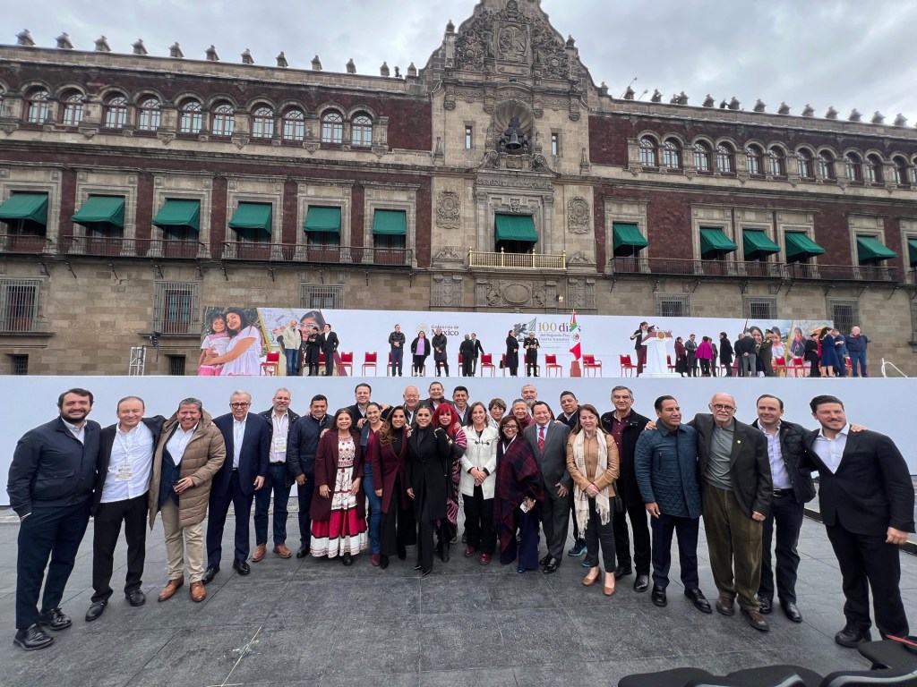 En la Plaza de la Constitución, frente al Palacio Nacional, en la Ciudad de México, se dieron cita las gobernadoras y los gobernadores del país, así como funcionarios federales, representantes de las fuerzas armadas, de los diversos sectores sociales del país, para escuchar a la primera Presidenta de México.