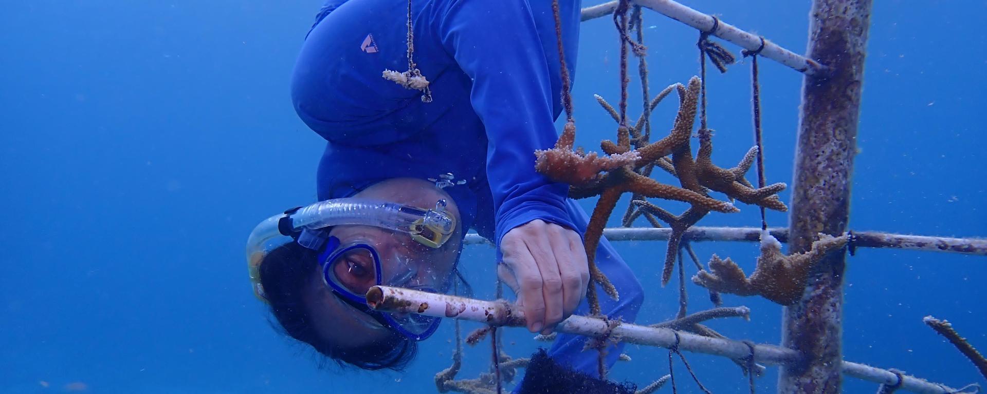 El programa de restauración de arrecifes de la FPMC abarca el monitoreo y mantenimiento continuo de los corales, garantizando su crecimiento en condiciones óptimas y como parte de esta labor, el voluntariado juvenil participa en la limpieza de corales, retirando algas y residuos que afectan su desarrollo.