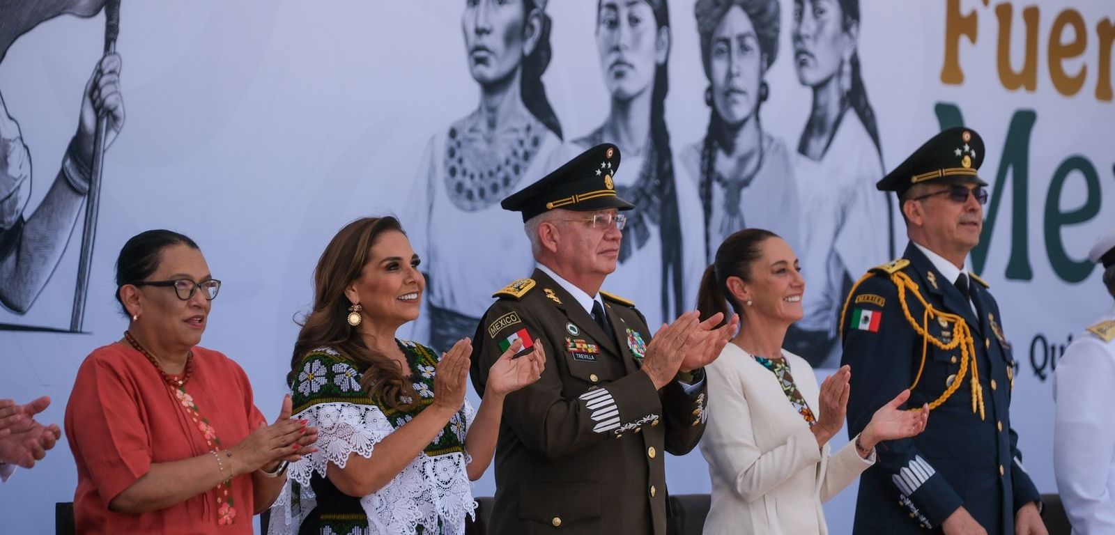 La gobernadora Mara Lezama estuvo en el presidium, junto al Secretario de la Defensa Nacional, Ricardo Trevilla Trejo; el Secretario de la Marina, Raymundo Pedro Morales Ángeles; el Comandante de la Fuerza Aérea Mexicana, Oscar René Rubio Sánchez, así como de más invitados.