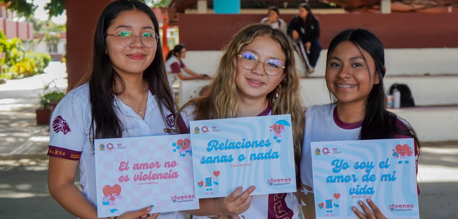 Chetumal.- Con la finalidad de brindar a las juventudes espacios de recreación donde puedan aprender sobre la importancia de relaciones sanas y libres de violencia, el Instituto Quintanarroense de la Juventud (IQJ), que encabeza Alma Alvarado Moo a través del programa “Jóvenes por la prevención” llevaron a cabo las jornadas “Amor es: No violencia” en diversas escuelas de la capital del estado.