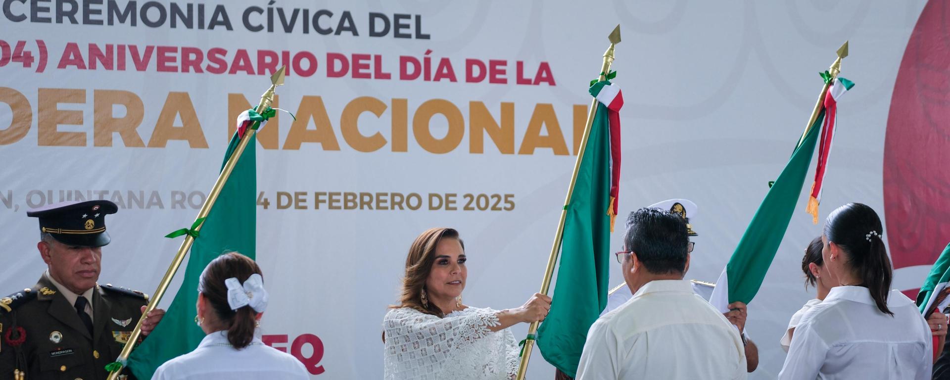 Previamente, la gobernadora de Quintana Roo izó la bandera monumental acompañada de la presidenta honoraria del Sistema DIF Quintana Roo, Verónica Lezama Espinosa; del General de Brigada de Estado Mayor, Fidel Mondragón Rivero, comandante de la 34ª Zona Militar; del Almirante AN. PAH. DEM Guadalupe Juan José Bernal Méndez, comandante de la 5ª Región Naval; del magistrado Heyden Cebada Rivas, presidente del Tribunal Superior de Justicia, de la presidenta municipal Ana Paty Peralta de la Peña; de la secretaria de Educación, Elda Xix Euán; del Comisario General Brigadier DEM José Luis Martínez Rojas, comandante de la 10ª Brigada de la Policía Militar y Coordinador Estatal de la Guardia Nacional, así como el diputado Eric Arcila Arjona.