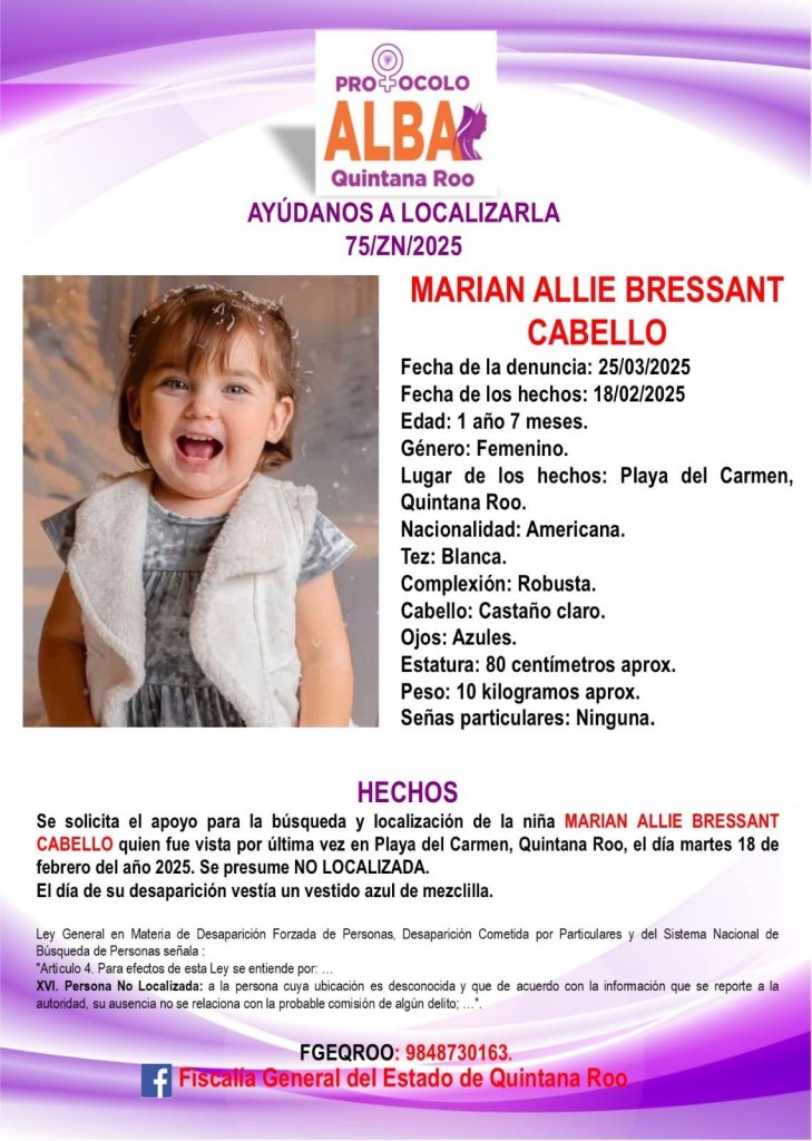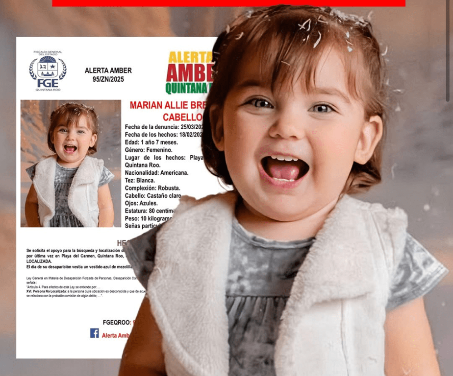 La Fiscalía de Quintana Roo emitió las Alertas Amber para localizar a Marian «N» de 1 año y 7 meses, así como para su hermanito Karim «N» de tres años de edad, lo cuales fueron vistos por última vez el 18 de febrero del 2025 en Playa del Carmen.