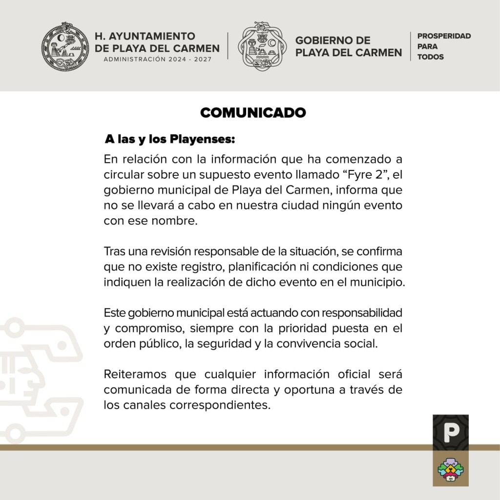 El H. Ayuntamiento de Playa del Carmen informó por medio de un comunicado que no se llevará a cabo ningún evento denominado “Fyre 2” en la Riviera Maya.