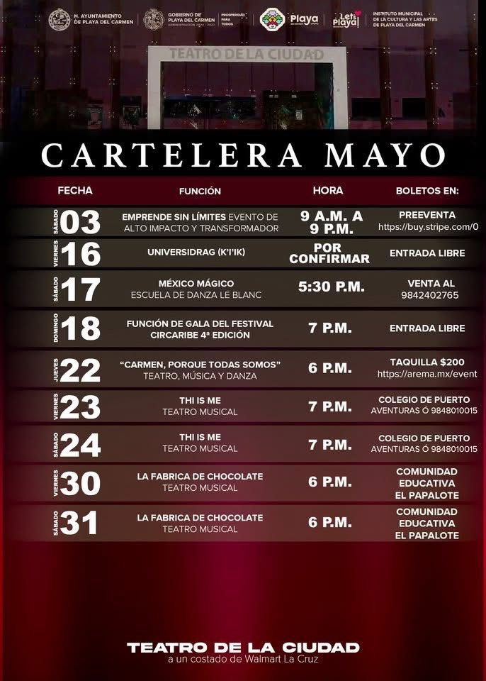 En cuanto a los shows de la iniciativa privada, “México Mágico” con la escuela de danza Le Blanc este 17 de mayo; “Carmen, porque somos todas”, el día 22 del presente; los días 23 y 24 se podrá disfrutar de “Thi is me”, mientras que la comunidad educativa “El Papalote” presentará el teatro musical “La fábrica de Chocolate” el 30 y 31.