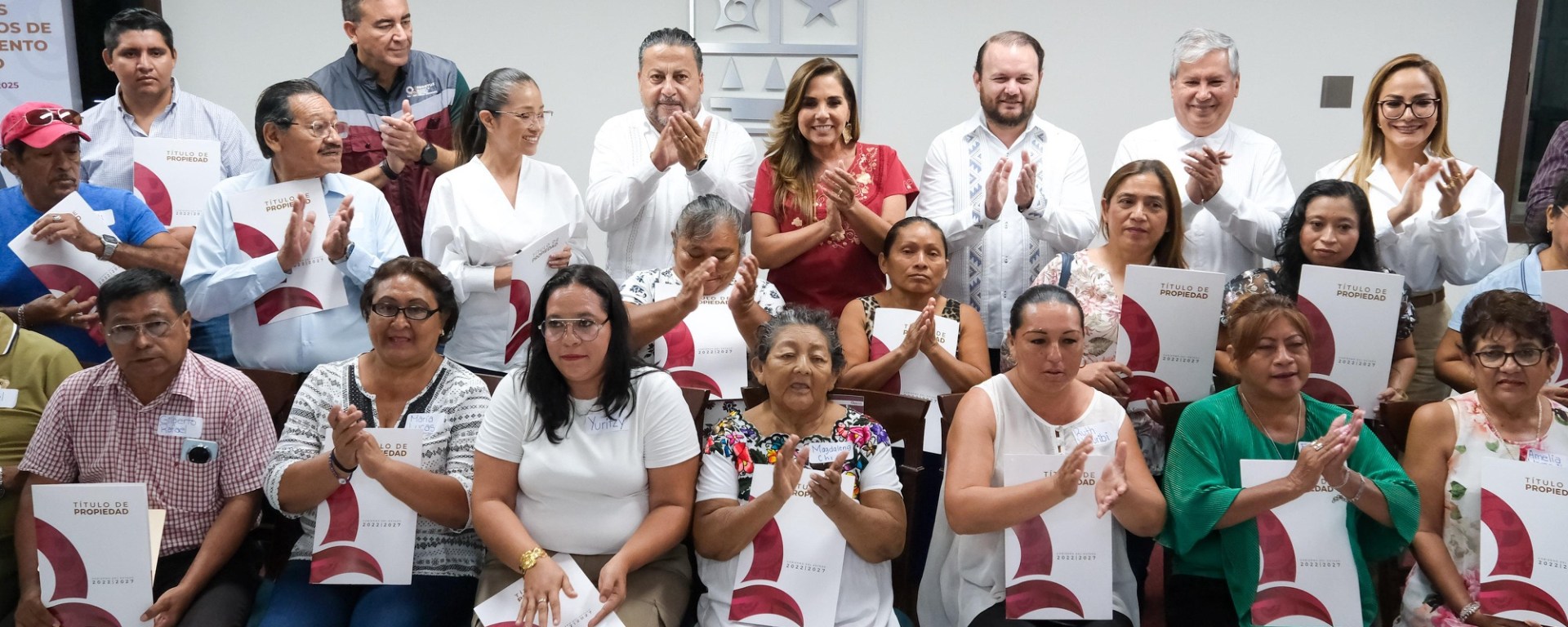 -Chetumal.- En un acto de auténtica justicia social y legalidad, la gobernadora Mara Lezama Espinosa encabezó la entrega de 32 títulos de propiedad que garantiza certeza patrimonial; algunas personas llevaban más de 30 y hasta 40 años en espera y a partir de hoy ya cuentan con seguridad jurídica sobre su patrimonio.