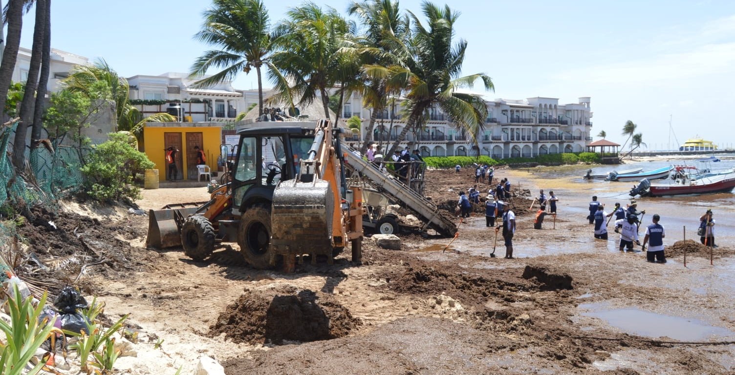 Actualmente, más de 100 personas trabajan en campo, entre personal municipal, brigadas estatales y 50 elementos navales desplegados por la Secretaría de Marina, así como maquinaria especializada y sargaceras marítimas proporcionadas por el Estado.