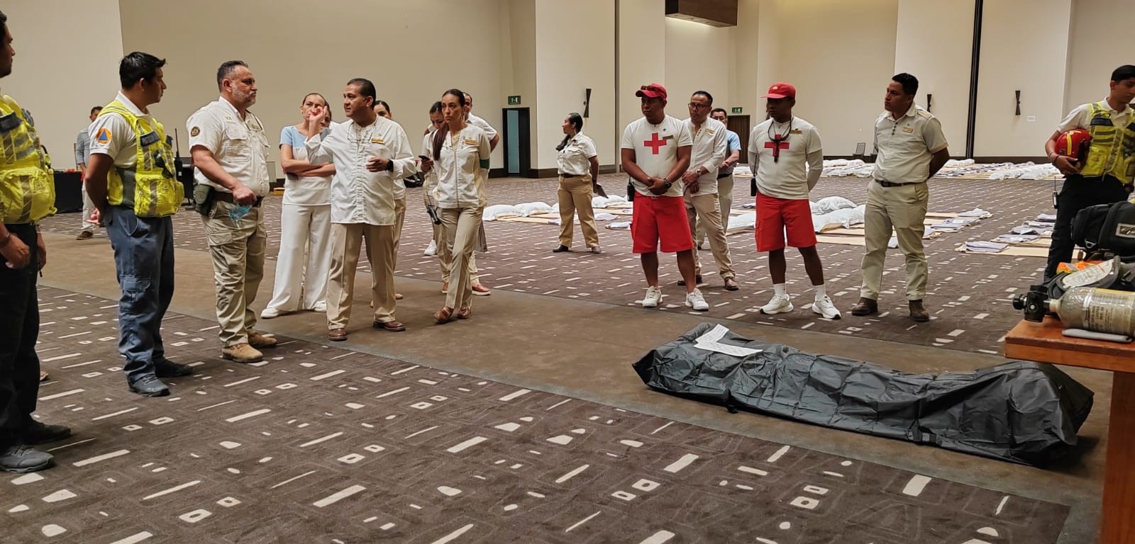 El secretario de Protección Civil, Darwin Covarrubias, explicó que la hipótesis contempló el impacto de un huracán categoría dos, lo que activó el protocolo de autorefugio, habilitando dormitorios, áreas de alimentación, equipo de protección personal y herramientas necesarias para la atención de la emergencia. También se instaló un área especial para mascotas y una zona común para la atención de huéspedes.