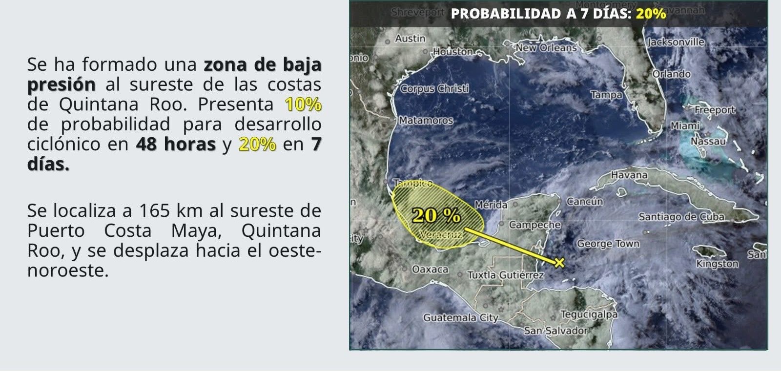 𝐀𝐮𝐭𝐨𝐫𝐢𝐝𝐚𝐝𝐞𝐬 𝐦𝐞𝐭𝐞𝐨𝐫𝐨𝐥𝐨́𝐠𝐢𝐜𝐚𝐬 𝐢𝐧𝐟𝐨𝐫𝐦𝐚𝐧 𝐬𝐨𝐛𝐫𝐞 𝐥𝐚 𝐟𝐨𝐫𝐦𝐚𝐜𝐢𝐨́𝐧 𝐝𝐞 𝐮𝐧𝐚 𝐳𝐨𝐧𝐚 𝐝𝐞 𝐛𝐚𝐣𝐚 𝐩𝐫𝐞𝐬𝐢𝐨́𝐧 𝐚𝐥 𝐬𝐮𝐫𝐞𝐬𝐭𝐞 𝐝𝐞 𝐥𝐚𝐬 𝐜𝐨𝐬𝐭𝐚𝐬 𝐝𝐞 𝐐𝐮𝐢𝐧𝐭𝐚𝐧𝐚 𝐑𝐨𝐨, 𝐜𝐨𝐧 𝟏𝟎% 𝐝𝐞 𝐩𝐫𝐨𝐛𝐚𝐛𝐢𝐥𝐢𝐝𝐚𝐝 𝐝𝐞 𝐝𝐞𝐬𝐚𝐫𝐫𝐨𝐥𝐥𝐨 𝐜𝐢𝐜𝐥𝐨́𝐧𝐢𝐜𝐨 𝐞𝐧 𝐥𝐚𝐬 𝐩𝐫𝐨́𝐱𝐢𝐦𝐚𝐬 𝟒𝟖 𝐡𝐨𝐫𝐚𝐬 𝐲 𝟐𝟎% 𝐞𝐧 𝐥𝐨𝐬 𝐩𝐫𝐨́𝐱𝐢𝐦𝐨𝐬 𝟕 𝐝𝐢́𝐚𝐬‧ 𝐀𝐮𝐧𝐪𝐮𝐞 𝐬𝐮 𝐞𝐯𝐨𝐥𝐮𝐜𝐢𝐨́𝐧 𝐞𝐬 𝐥𝐞𝐧𝐭𝐚, 𝐬𝐮 𝐜𝐞𝐫𝐜𝐚𝐧𝐢́𝐚 𝐫𝐞𝐩𝐫𝐞𝐬𝐞𝐧𝐭𝐚 𝐮𝐧 𝐫𝐢𝐞𝐬𝐠𝐨 𝐝𝐞 𝐥𝐥𝐮𝐯𝐢𝐚𝐬 𝐢𝐧𝐭𝐞𝐧𝐬𝐚𝐬 𝐩𝐚𝐫𝐚 𝐥𝐚 𝐫𝐞𝐠𝐢𝐨́𝐧‧
