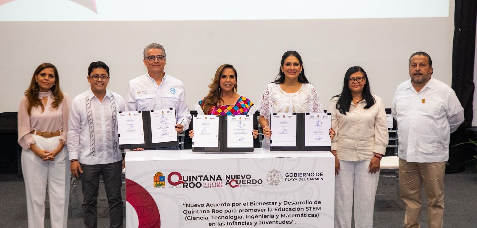 Acompañadas por Francisco Wilson, presidente de la Academia STEM Iberoamérica (México), también firmaron el convenio por el Nuevo Acuerdo para el Bienestar y Desarrollo de Quintana Roo, entre el Gobierno del Estado, a través del COQHCYT, el municipio de Playa del Carmen y la Sociedad Civil Academia STEM Iberoamérica, a fin de impulsar y fomentar que las infancias y juventudes tengan acceso a cursos, talleres, eventos y demás actividades relacionadas, que fortalezcan el acceso a la educación de calidad, fomenten la inclusión tecnológica y preparen a las nuevas generaciones para enfrentar los desafíos del futuro en un mundo globalizado.