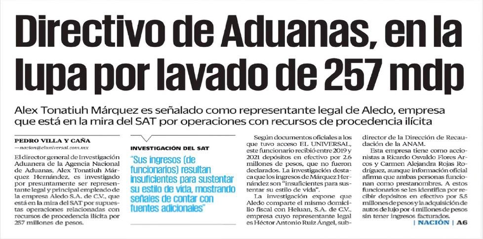 Según un reportaje de El Universal, Alex Tonatiuh Márquez Hernández, director de Investigación Aduanera en la ANAM, está siendo investigado por presuntas operaciones financieras irregulares por más de 257 millones de pesos.