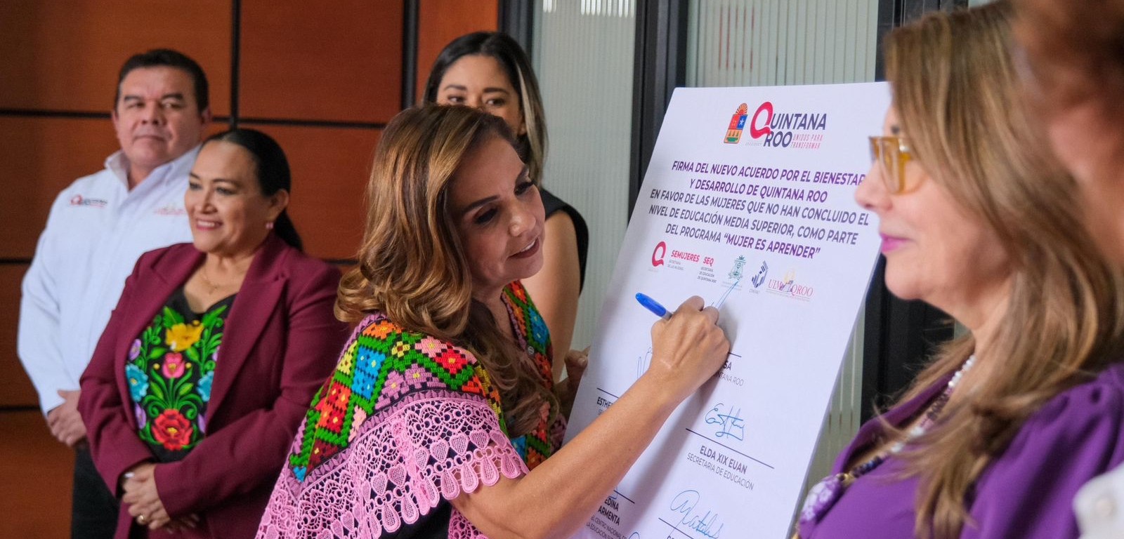 Este acuerdo fue suscrito por la gobernadora Mara Lezama; la Directora General del CENEVAL, Carmen Enedina Rodríguez Armenta; la Secretaria de las Mujeres de Quintana Roo, Esther Burgos Jiménez; la Secretaria de Educación de Quintana Roo, Elda Xix Eúan; la Rectora de la Universidad Autónoma de Quintana Roo (UAQROO), Consuelo Natalia Fiorentini Cañedo; el Rector de la Universidad Intercultural Maya de Quintana Roo (UIMQROO), William Briceño Guzmán y la Coordinadora del programa Mujer Es Poder, Bridget Ortega Aviña.