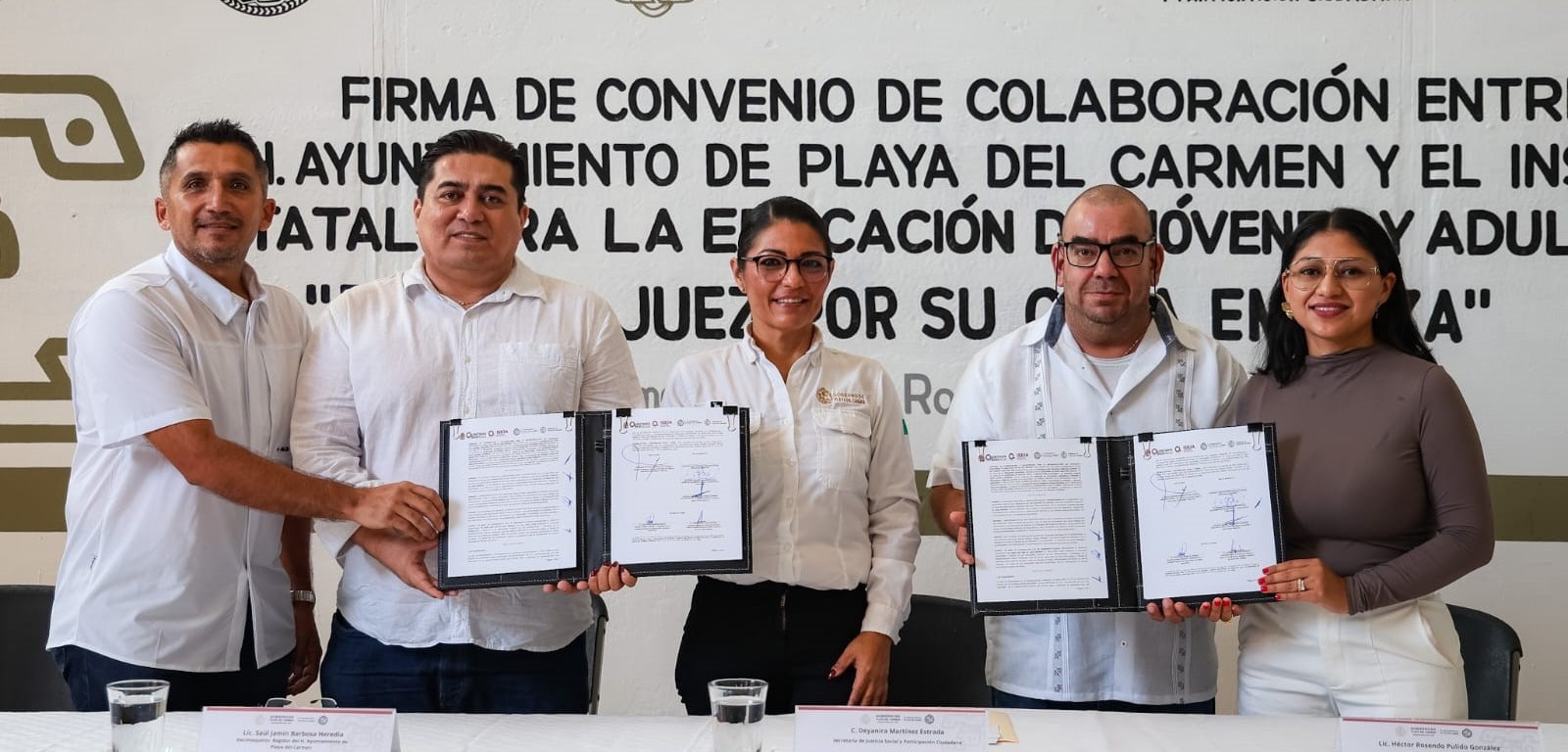 Playa del Carmen, Quintana Roo, 15 de agosto de 2025.- El Gobierno de Playa del Carmen, que encabeza la presidenta municipal Estefanía Mercado, y el Instituto Estatal para la Educación de Jóvenes y Adultos (IEEJA) firmaron el convenio de colaboración del programa “El buen juez por su casa empieza”, con el objetivo de facilitar el acceso y la conclusión de la educación básica para las y los trabajadores del Ayuntamiento que no han finalizado sus estudios.