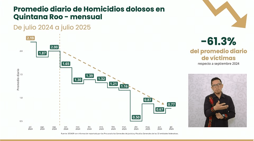 Chetumal, QRoo.- En la conferencia matutina realizada este viernes 15 de agosto desde Chetumal, el secretario de Seguridad y Protección Ciudadana, Omar García Harfuch, presentó un informe alentador sobre la situación delictiva en Quintana Roo: