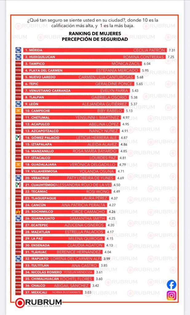 Playa del Carmen, Quintana Roo; 12 de septiembre 2025. — De acuerdo con la empresa encuestadora Rubrum, en su más reciente evaluación nacional de alcaldesas (septiembre 2025), Playa del Carmen se ubicó en el 4º lugar nacional en percepción de seguridad, consolidándose como uno de los municipios más seguros del país bajo el liderazgo de la presidenta municipal Estefanía Mercado.