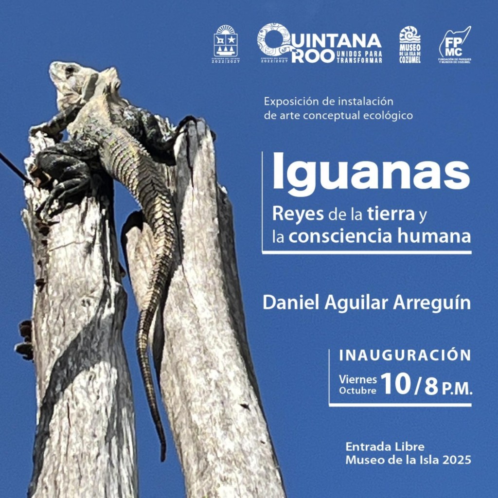Cozumel.- La Fundación de Parques y Museos de Cozumel (FPMC) vuelve a apostar por el arte contemporáneo y la reflexión ambiental con la inauguración de la instalación de arte conceptual “Iguanas: Reyes de la Tierra y la Consciencia Humana”, del artista multidisciplinario Daniel Aguilar Arreguín. La cita es el viernes 10 de octubre, a las 20:00 horas, en el Museo de la Isla, donde el público podrá sumergirse en una experiencia que une creatividad, naturaleza y conciencia ecológica.