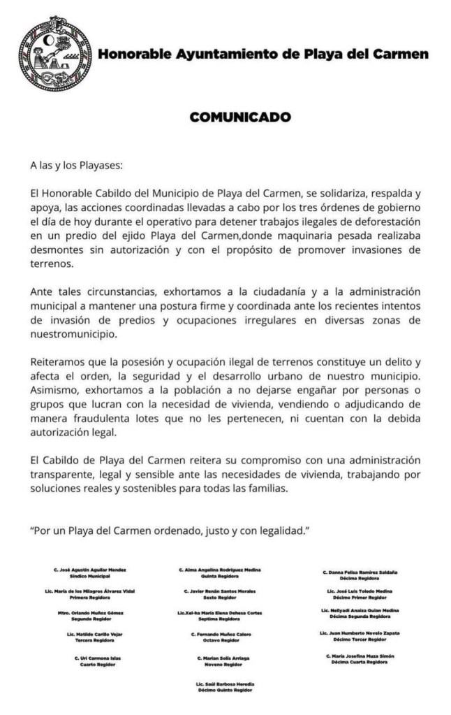 Playa del Carmen, Q.Roo.- Por medio de un comunicado, los miembros del Cabildo del Municipio de Playa del Carmen se solidarizaron y respaldaron las acciones coordinadas por los tres órdenes de gobierno para detener los trabajos ilegales en el Ejido de Playa del Carmen.