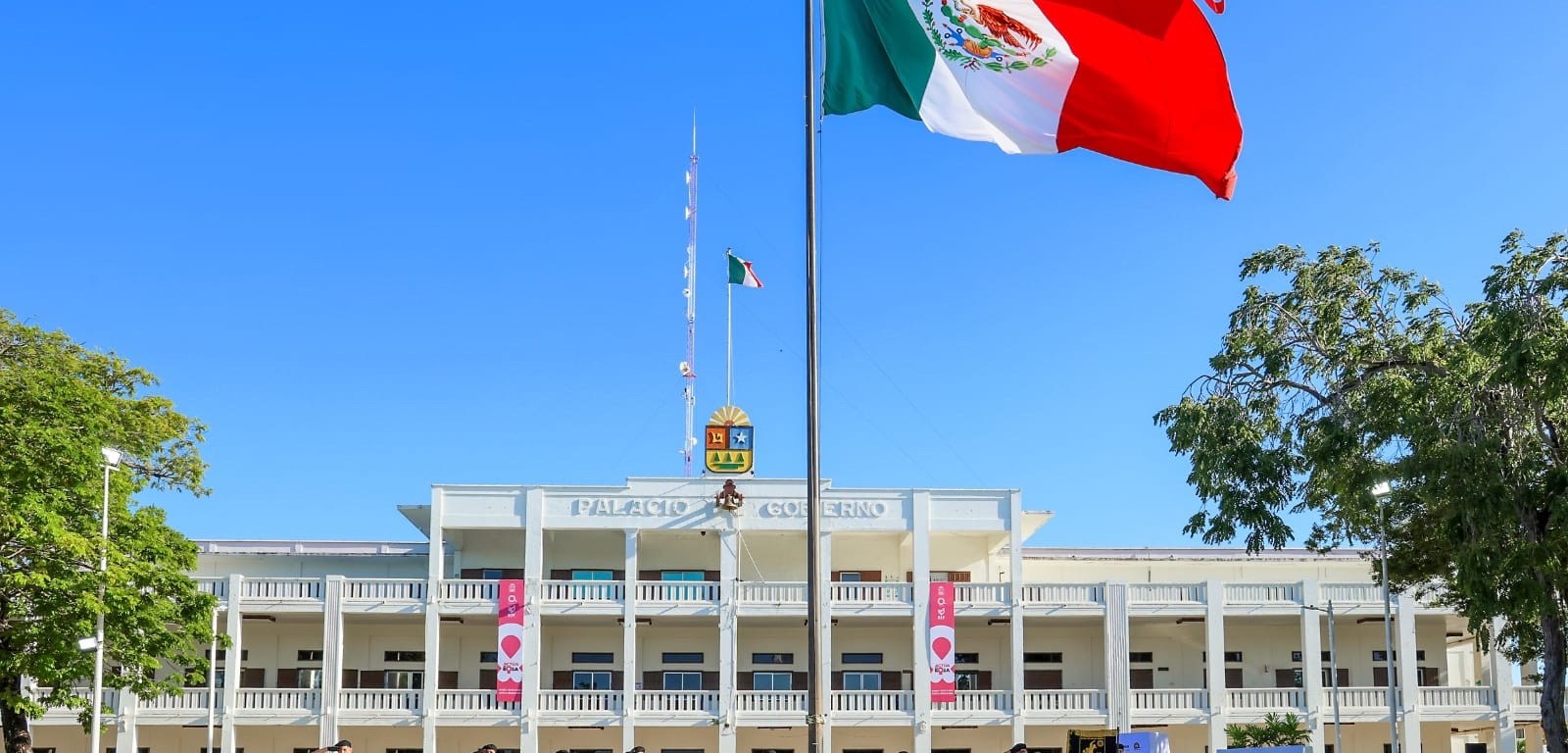 Los honores a la bandera estuvieron a cargo de la Escolta y Banda de Guerra “Panteras” de la Escuela Secundaria General No. 7 “David Alfaro Siqueiros”, agrupaciones que también formaron parte de la Banda de Guerra Monumental durante el Grito de Independencia, el pasado 15 de septiembre, y en la conmemoración del 51 aniversario de la creación del Estado, el 8 de octubre, encabezada por la gobernadora Mara Lezama Espinosa.