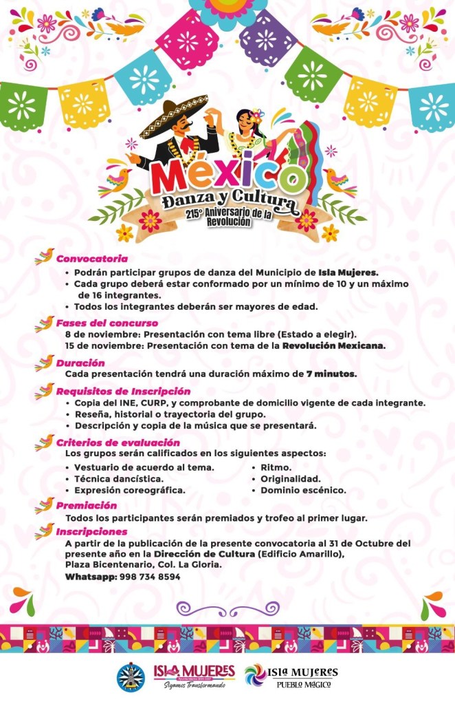 Isla Mujeres, Q. Roo, 23 de octubre de 2025.- Con el objetivo de preservar las tradiciones, fortalecer la identidad nacional e impulsar el talento artístico local, el Gobierno de Isla Mujeres, encabezado por la Presidenta Municipal, Atenea Gómez Ricalde, abrió la convocatoria del concurso “México Danza y Cultura, 215° Aniversario de la Revolución”.