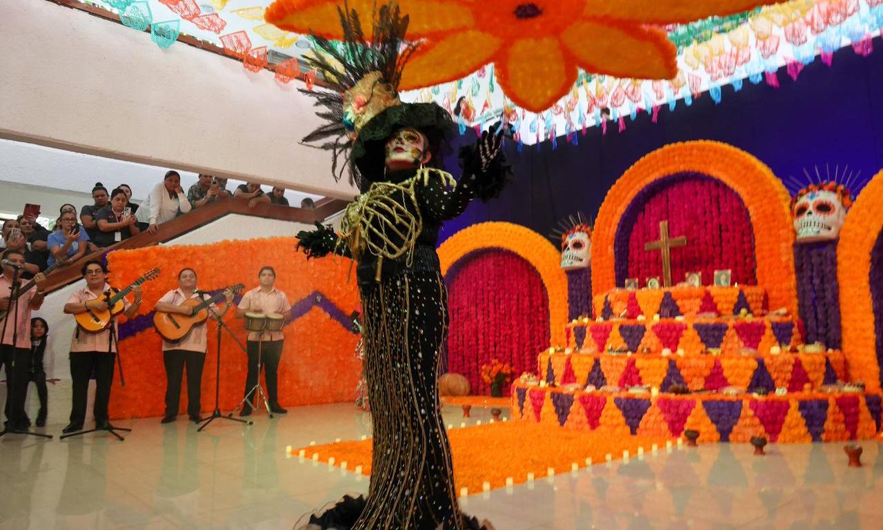 Cancún, Q. R., a 31 de octubre de 2025.- “Un altar de muertos representa un puente espiritual entre el mundo de los vivos y el de los muertos, simboliza la bienvenida y el recuerdo de los difuntos en el Día de Muertos”, dijo la Oficial Mayor, Nora Espinoza Hernández, en representación de la Presidenta Municipal, Ana Paty Peralta, durante la inauguración del altar alusivo a los ex presidentes municipales de Benito Juárez en el domo del Palacio Municipal, como parte de las tradiciones mexicanas que unen a las familias cancunenses.