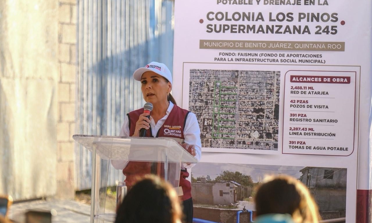 Cancún.- La gobernadora Mara Lezama Espinosa acompañó a la presidenta municipal de Benito Juárez, Ana Paty Peralta de la Peña, en el inicio de la obra de construcción de la red de drenaje y agua potable de la colonia Los Pinos, que cumple 25 años de creación, en beneficio directo de casi mil 500 habitantes.