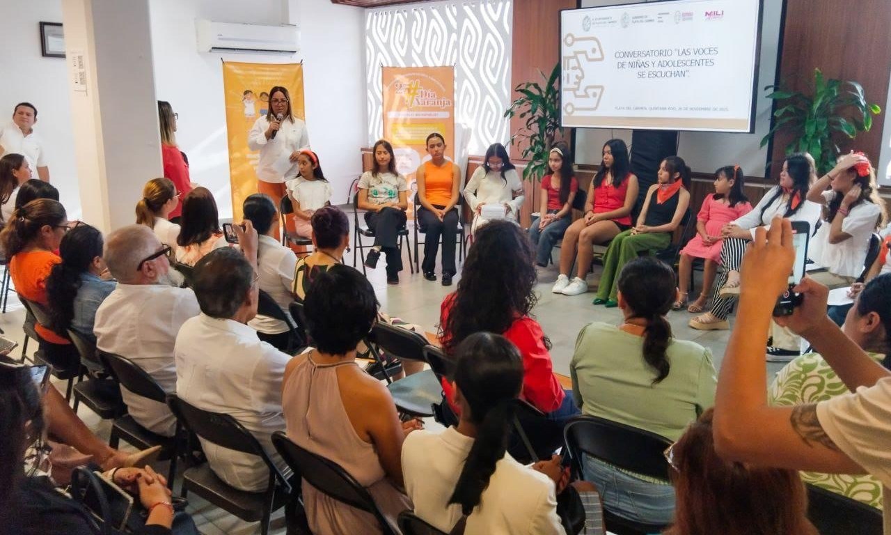 Playa del Carmen, Quintana Roo, 28 de noviembre de 2025.— En el marco del Día Naranja, el gobierno municipal, que encabeza la presidenta Estefanía Mercado, llevó a cabo, a través del Sistema de Protección Integral de Niñas, Niños y Adolescentes (SIPINNA) y la Primera Regiduría, el Conversatorio “Las voces de niñas y adolescentes se escuchan” en el salón «Javier Rojo Gómez», un espacio destinado a escuchar sus reflexiones y promover la participación activa de las niñas y adolescentes en la defensa de sus derechos.