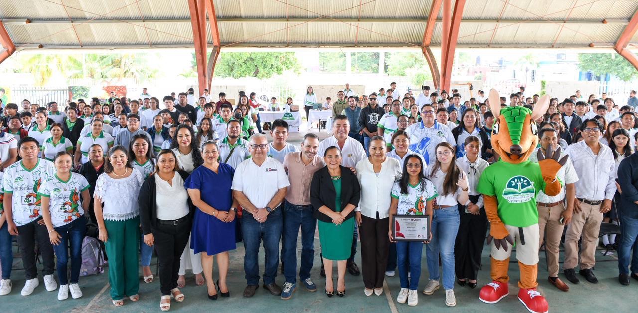 La titular de la SEQ también presentó a “Weech” (Armadillo), la mascota oficial del Telebachillerato Comunitario de Quintana Roo, además entregó un reconocimiento a la exalumna del Telebachillerato Kancabchen, Harumi Jhoana Olán Kú, creadora de la mascota.