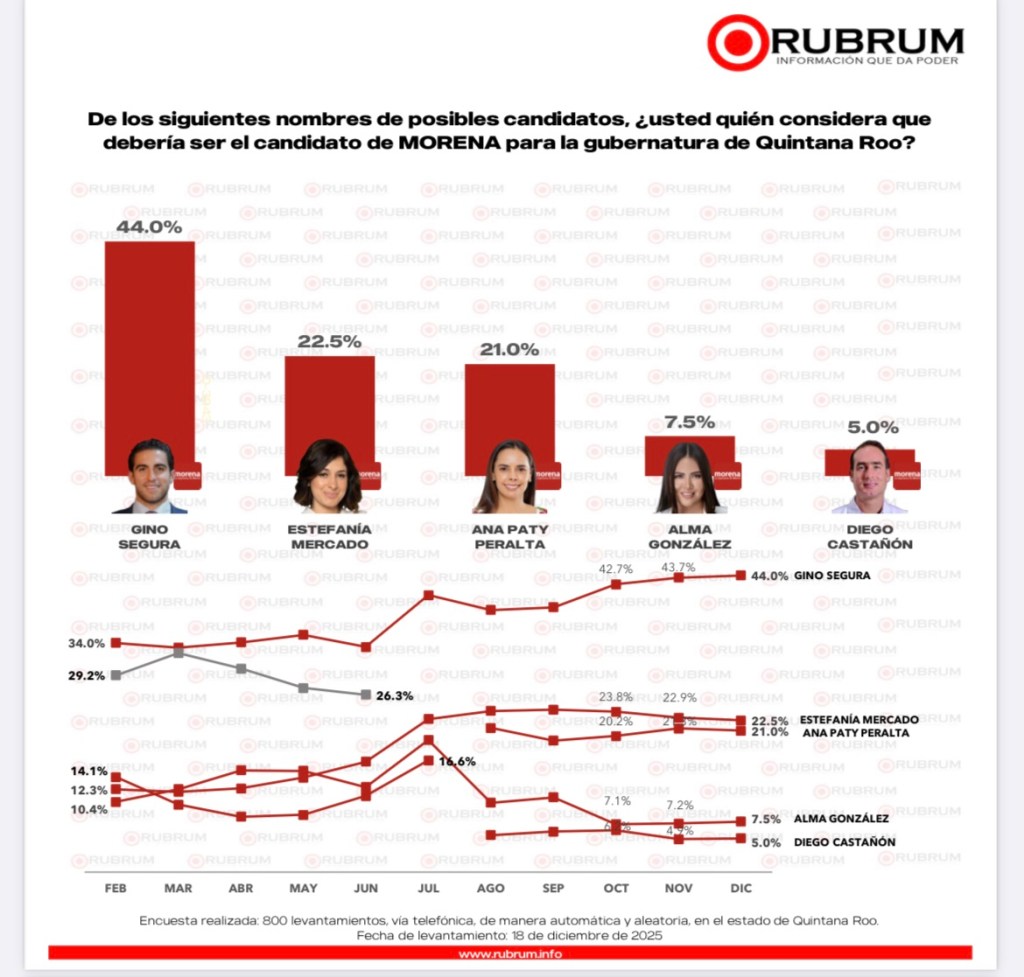 Quintana Roo, diciembre de 2025.— De acuerdo con la más reciente medición de la casa encuestadora Rubrum, Gino Segura y Estefanía Mercado encabezan las preferencias internas de Morena rumbo a la definición de su candidatura para la gubernatura de Quintana Roo en 2027.
