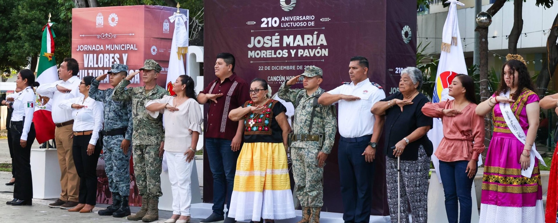 Cancún, Q. R., a 22 de diciembre de 2025.- Con la bandera a media asta, funcionarios municipales y ciudadanos en general conmemoraron el 210 aniversario luctuoso de José María Morelos y Pavón, que se llevó a cabo en el parque “La Corregidora” mejor conocido como “El Crucero”.