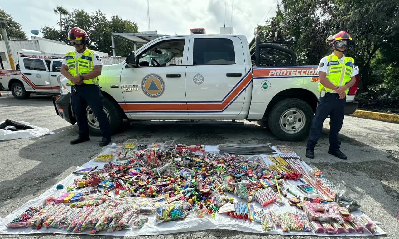 Bajo la coordinación del secretario de Protección Civil de Playa del Carmen, Darwin Covarrubias, durante el operativo más de 200 kilogramos de pirotecnia fueron asegurados en un punto donde se detectó la instalación irregular de mesas sobre la vía pública en el fraccionamiento Villas del Sol, mientras que el resto del material fue localizado y decomisado en diversos puntos de la zona comercial, como resultado del recorrido preventivo.