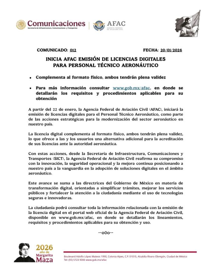 En un paso decisivo hacia la transformación tecnológica del cielo mexicano, la Agencia Federal de Aviación Civil (AFAC) anunció que, a partir de este 22 de enero, comenzará la emisión de licencias digitales para todo el personal técnico del país. Esta medida, impulsada por la Secretaría de Infraestructura, Comunicaciones y Transportes (SICT), busca agilizar la burocracia aérea y elevar los estándares de seguridad mediante el uso de herramientas de última generación.