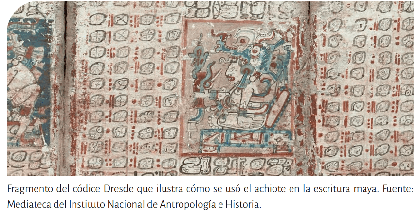 Para los antiguos mayas, el color rojo del achiote simbolizaba vitalidad, energía, sangre, fuego y el sol. Este pigmento natural, la bixina, iluminaba altares, decoraba cuerpos en rituales y se utilizaba incluso en contextos bélicos para transmitir mensajes de poder. Su importancia era tal que incluso quedó plasmado en la escritura de los códices prehispánicos, como el Códice Dresde.