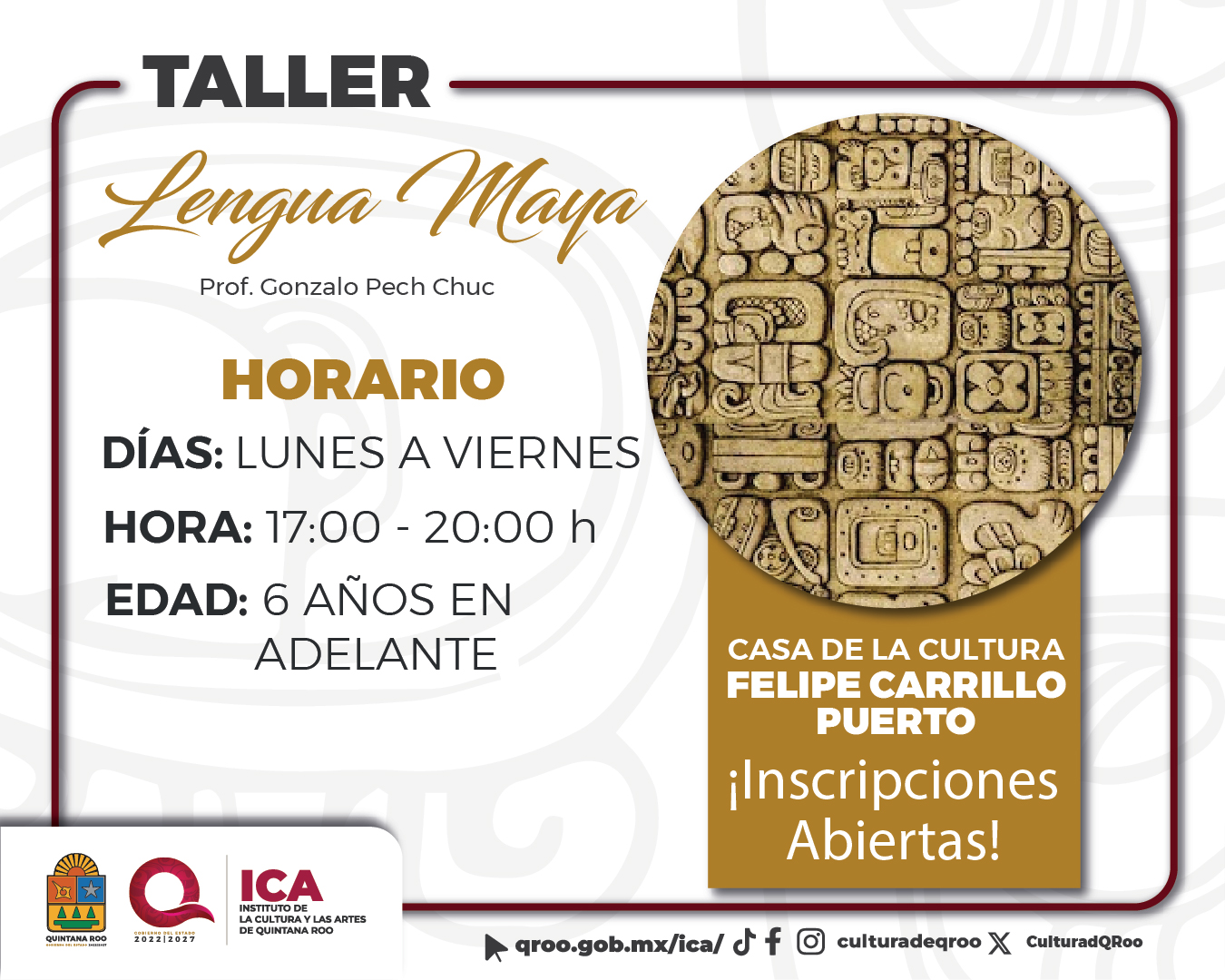 - Lengua Maya: Lunes a viernes de 17:00 a 20:00 h. (Desde los 6 años).