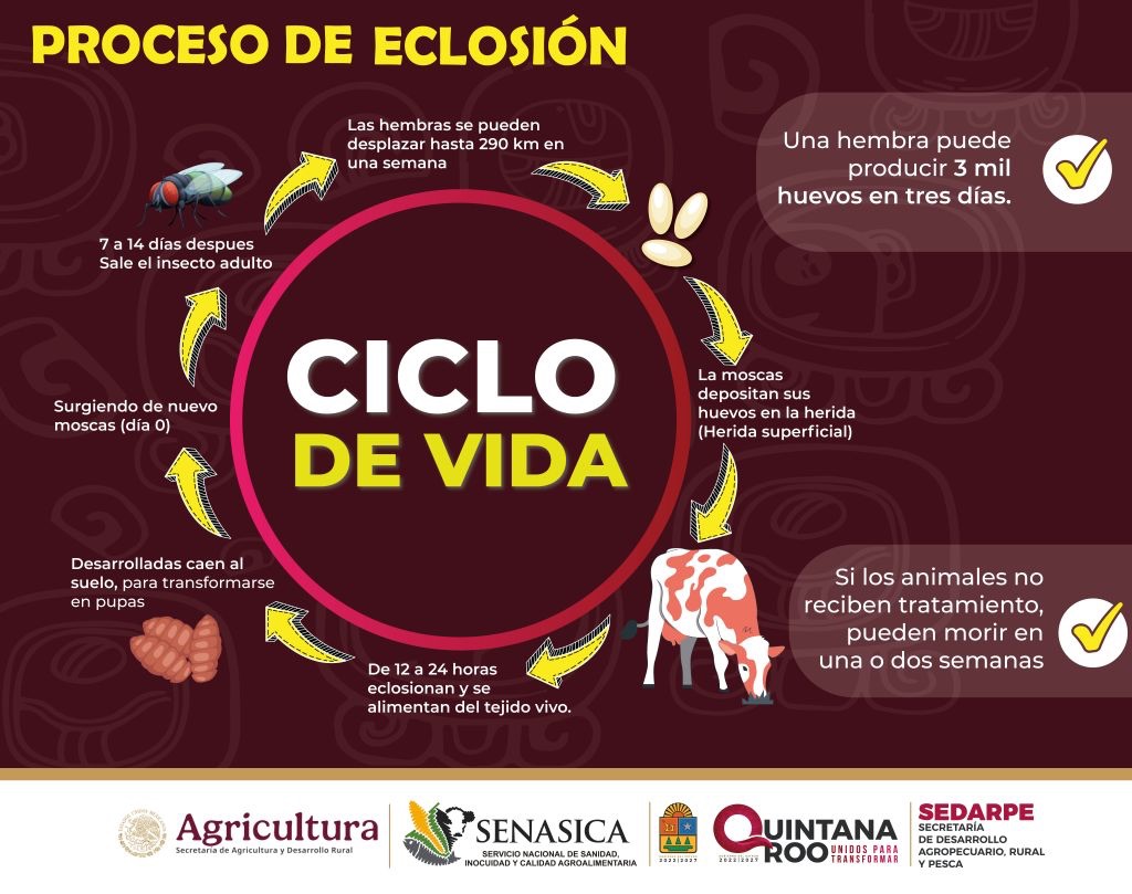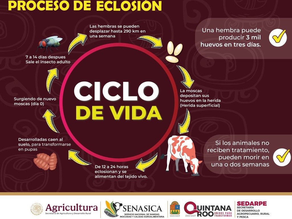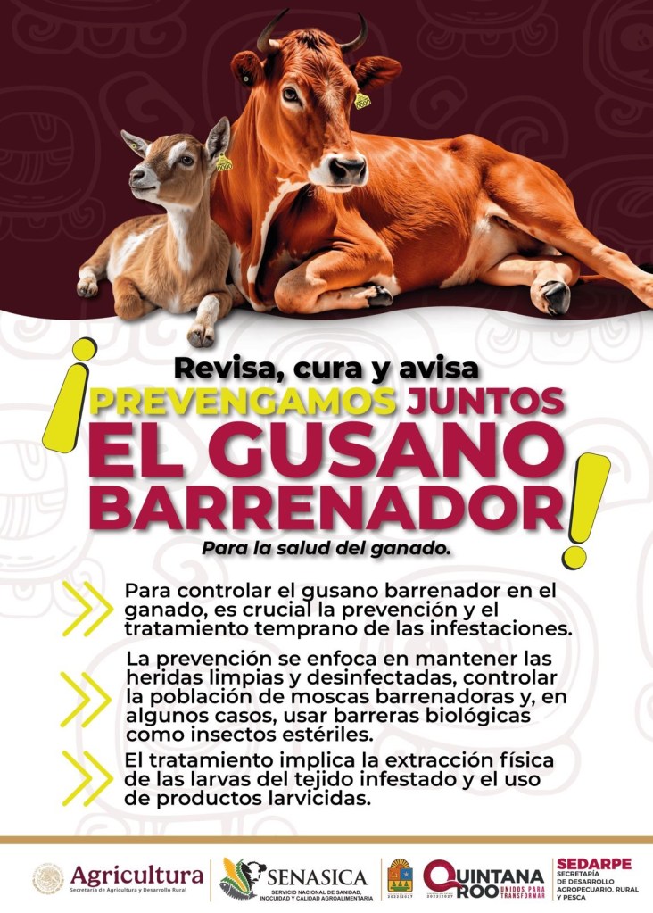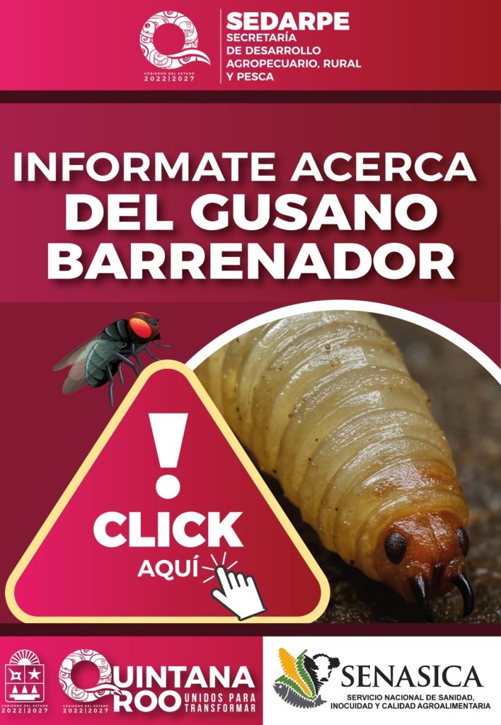 Chetumal.-La Secretaría de Desarrollo Agropecuario, Rural y Pesca (SEDARPE) informó que, en conjunto con el Servicio Nacional de Sanidad, Inocuidad y Calidad Agroalimentaria (SENASICA), continúa con la vigilancia permanente para atender la plaga zoosanitaria del gusano barrenador del ganado. Al corte del 19 de enero, se han contabilizado 394 casos acumulados, de los cuales 45 permanecen activos.