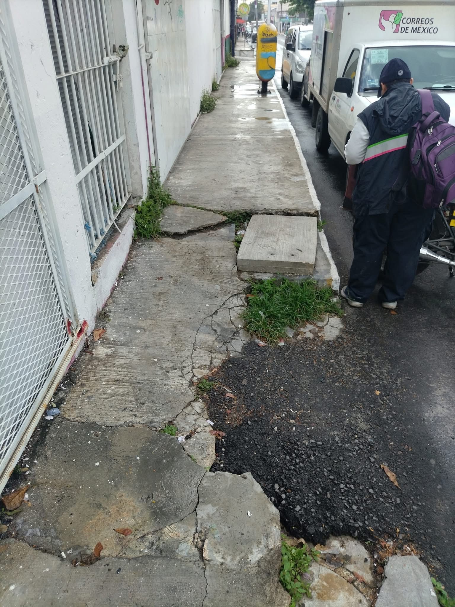 En la fotografía se observa el síntoma más claro de la improvisación: un «parche» de concreto liso que interrumpe bruscamente el diseño de la vía peatonal. Este tipo de acabados denuncian dos realidades innegables: