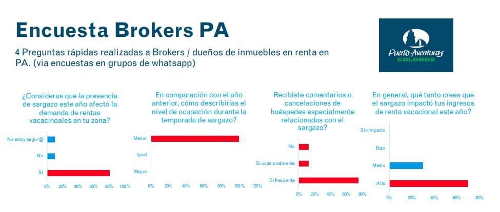 Otro argumento presentado por esta asociación es una encuesta efectuada entre dueños o brokers, en donde el 80% consideró que el sargazo afectó las rentas vacacionales, el 100% indicaron que la ocupación fue menor; 80% dijo haber tenido quejas y un 70% dijo que el impacto económico había sido alto.