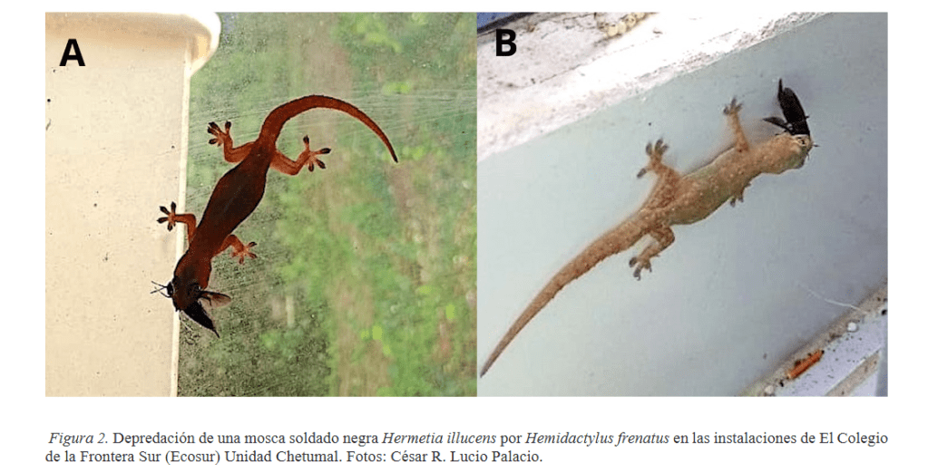 - Eliminación de plagas de jardín: El geco también depreda diversas polillas y mariposas, como la polilla común del hongo (Metalectra discalis) y la mariposa saltarina (Cecropterus dorantes), ayudando a equilibrar la población de insectos en espacios antropizados.