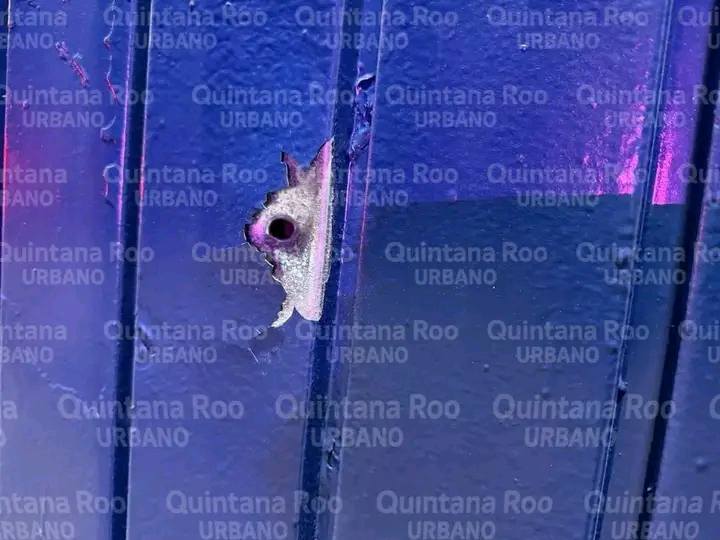 - Daños colaterales: Una de las balas logró atravesar las rendijas del portón e impactó la parte frontal de un camión repartidor que se encontraba estacionado en el interior.