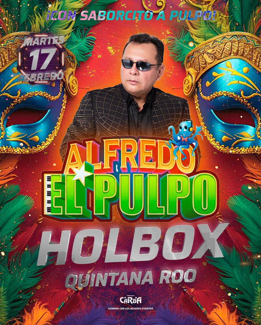 - Martes 17 de febrero | Holbox:Para el cierre de las festividades, la Isla de Holbox recibirá a Alfredo «El Pulpo» y sus Teclados. El músico, reconocido por su agilidad en el escenario y su popularidad en el sureste mexicano, pondrá el toque final al martes de carnaval con su característico «saborcito a pulpo».