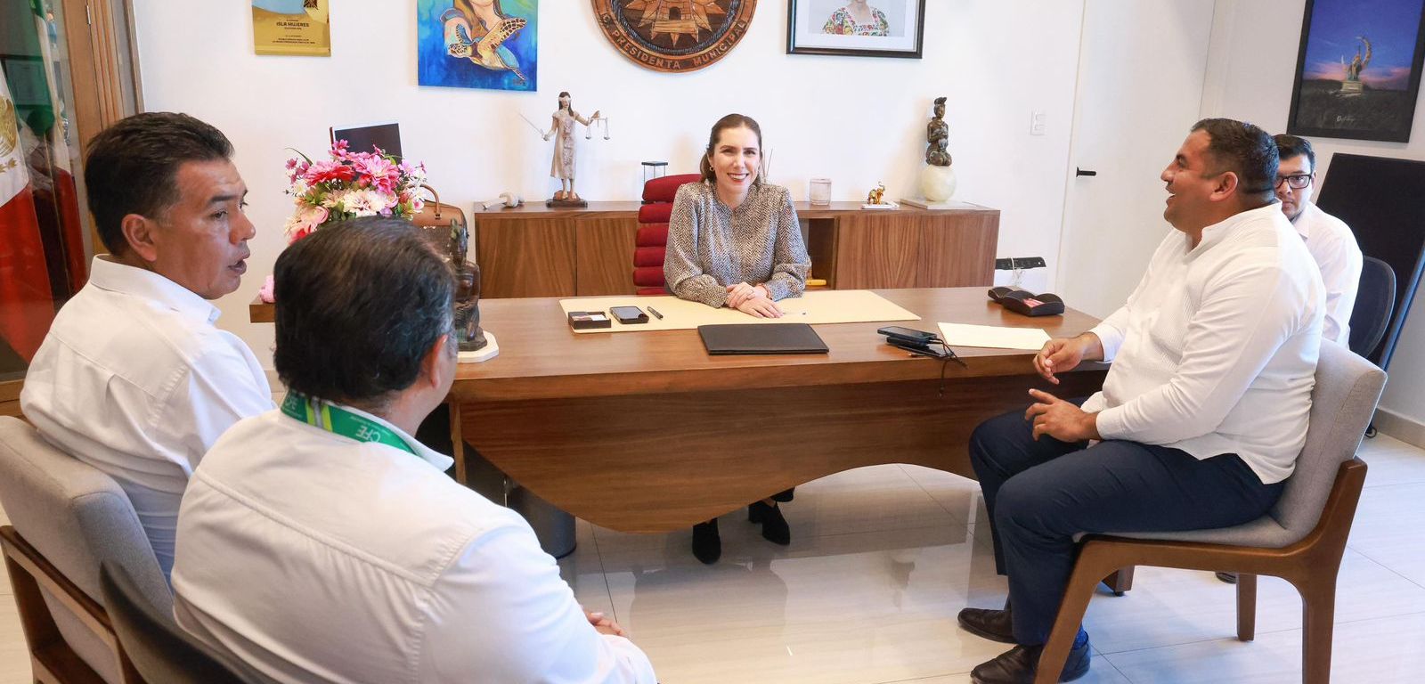 Isla Mujeres, Quintana Roo, 04 de febrero de 2026.– Con el objetivo de continuar transformando la imagen urbana del municipio y fortalecer la infraestructura de servicios básicos, la Presidenta Municipal, Atenea Gómez Ricalde, sostuvo una reunión de trabajo con el Superintendente Héctor Raúl Pérez Arjona y directivos de la Comisión Federal de Electricidad (CFE), para dar seguimiento a los proyectos programados para 2026, enfocados a la continuidad del soterramiento de la red de energía eléctrica en la colonia Centro.