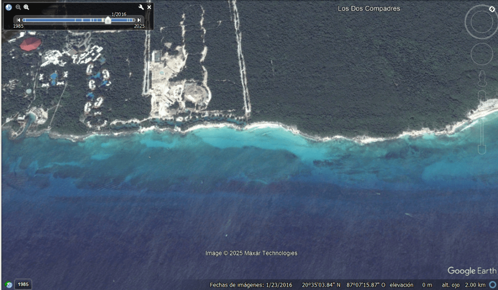 Lo que hoy se presenta como un paraíso de exclusividad náutica y arquitectónica bajo el sello de Grupo Xcaret, es en realidad el resultado de una de las alteraciones geológicas más agresivas en la historia reciente de Quintana Roo. Una investigación basada en registros satelitales, datos métricos y evidencia de campo demuestra cómo, en un periodo de apenas cinco años, la empresa fragmentó el litoral, destruyó el suelo costero e invadió la Zona Federal Marítimo Terrestre (ZOFEMAT).
