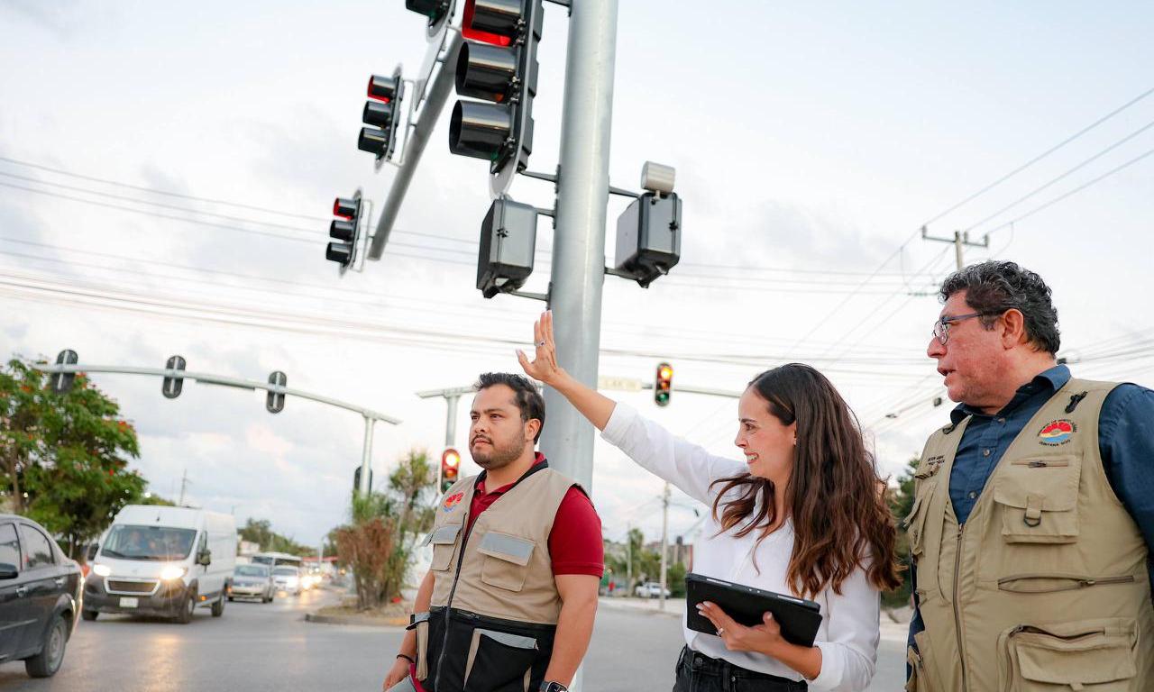 En esta ocasión, la Alcaldesa visitó el cruce de la avenida Orquídeas con avenida Lak’in, donde constató el progreso de la obra de modernización de la red de semáforos, que registra un avance del 58 por ciento. “Este proyecto forma parte de un programa integral que contempla la instalación de semáforos vehiculares y peatonales, así como adecuaciones geométricas para mejorar la circulación y tecnología de control de tráfico enlazada al Centro de Monitoreo” detalló.