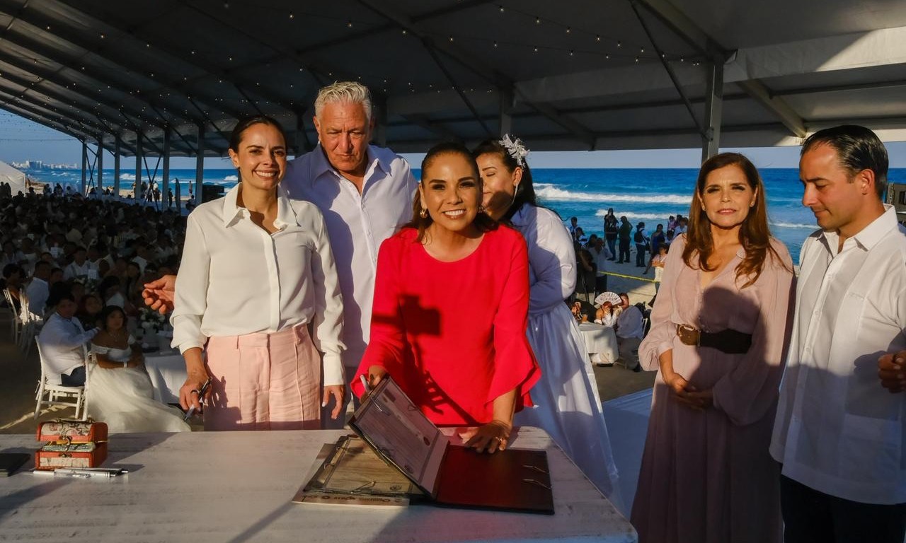 Cancún.- En un ambiente festivo frente al mar Caribe, 357 parejas contrajeron matrimonio civil durante las Bodas Colectivas 2026, celebradas en Playa Delfines y atestiguadas por la gobernadora Mara Lezama Espinosa, la presidenta honoraria del DIF, Verónica Lezama Espinosa y la presidenta municipal Ana Paty Peralta.