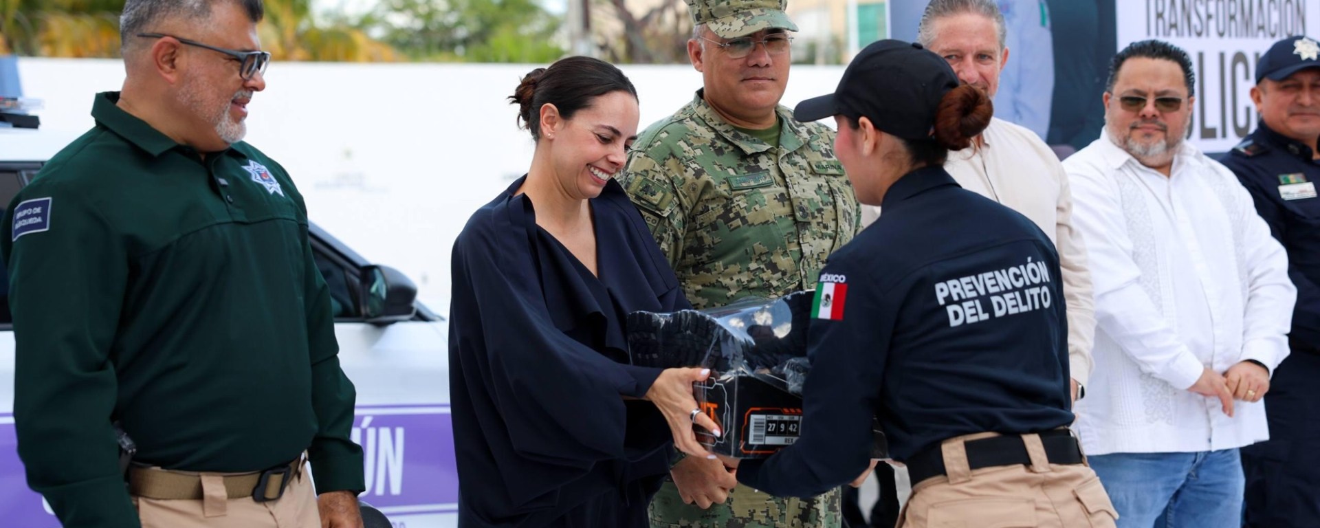 Cancún, Q. R., a 24 de febrero de 2026.- Con el objetivo de dignificar la labor de las y los policías y continuar avanzando en la recuperación de la tranquilidad de las familias benitojuarenses, la Presidenta Municipal, Ana Paty Peralta, encabezó la entrega de uniformes para la Transformación Policial en la explanada de la Secretaría Municipal de Seguridad Ciudadana y Tránsito.