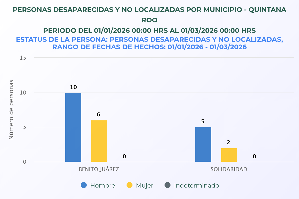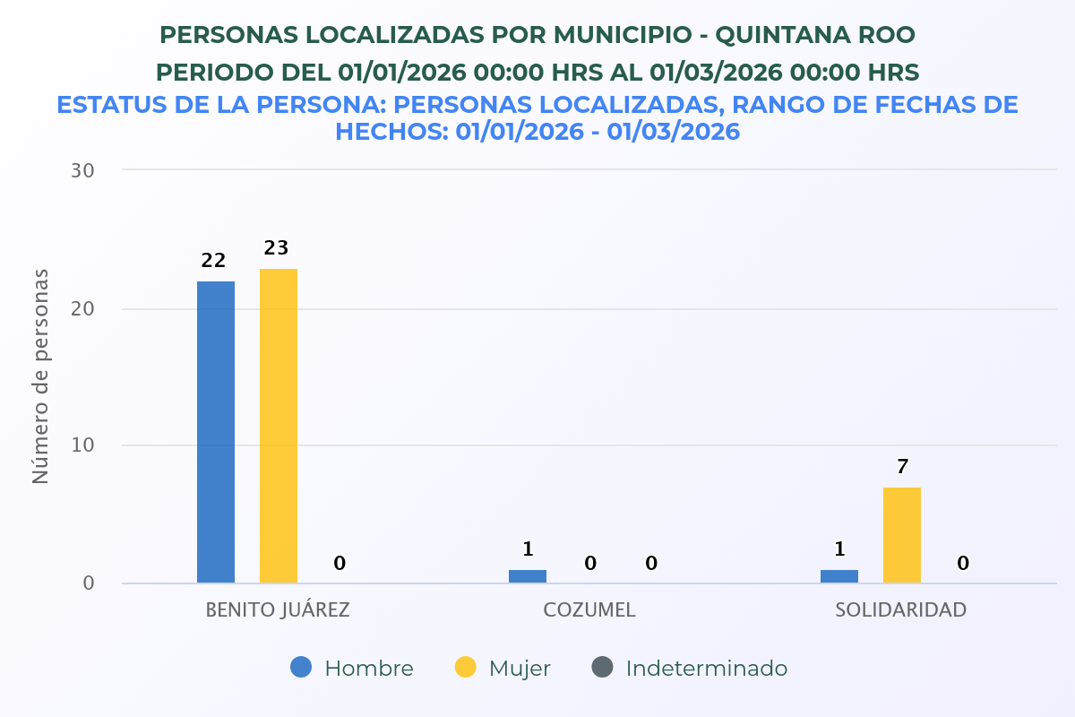 Durante el primer bimestre del presente año, el estado de Quintana Roo ha mostrado una tendencia favorable en las labores de búsqueda y recuperación de personas. Según los datos oficiales del Registro Nacional de Personas Desaparecidas y No Localizadas (RNPDNO), entre el 1 de enero y el 1 de marzo de 2026, se ha logrado la localización de 54 personas con vida en los municipios de Benito Juárez, Cozumel y el municipio de Solidaridad (cuya denominación oficial se encuentra en proceso de transición este año)