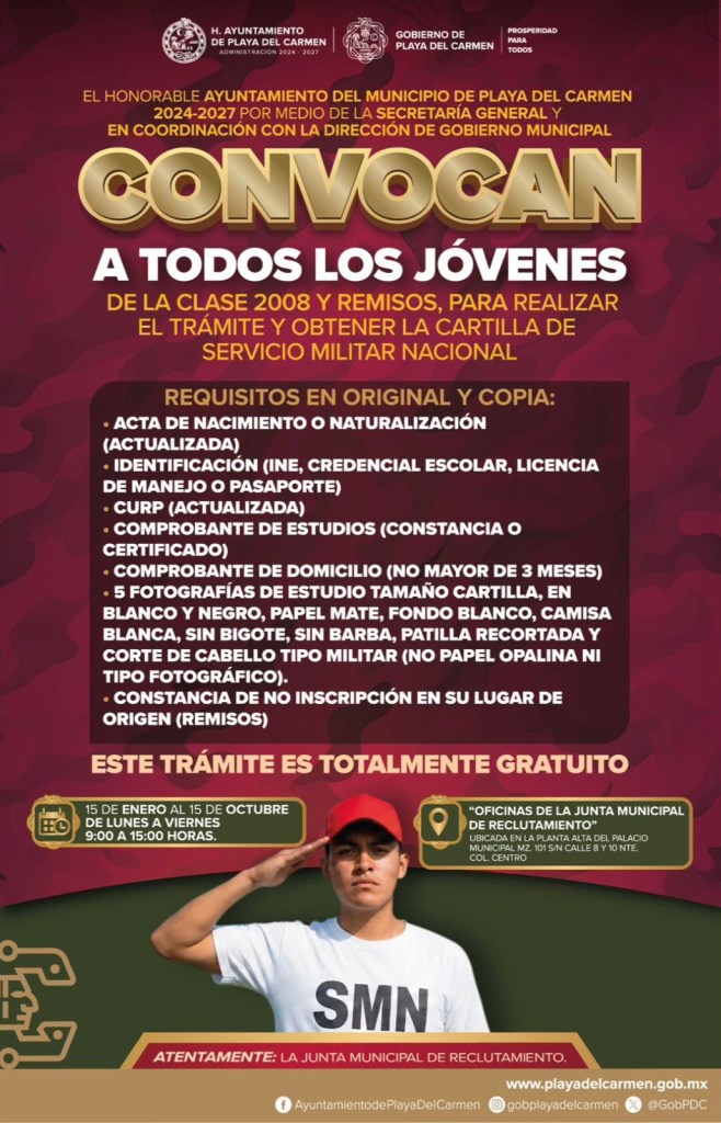 Playa del Carmen, Q. Roo, 2 de marzo de 2026.— El gobierno de Playa del Carmen, encabezado por la presidenta Estefanía Mercado, convocó, a través de la Secretaría General y la Dirección de Gobierno Municipal, a los jóvenes de la clase 2008 y remisos a realizar el trámite para obtener la Cartilla del Servicio Militar Nacional, documento oficial con validez tanto en México como en el extranjero.