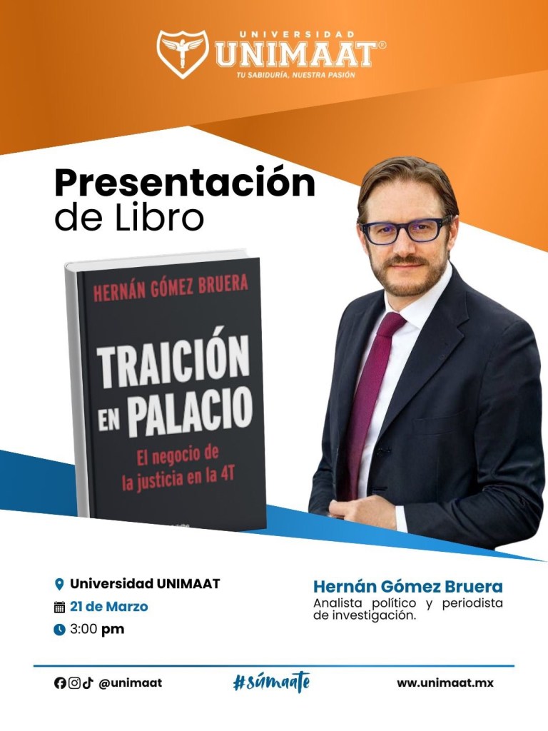 Cancún, Quintana Roo. – El próximo sábado 21 de marzo de 2026, la Universidad UNIMAAT de Cancún se convertirá en el epicentro del análisis político y periodístico con la presentación del libro “Traición en Palacio”, del reconocido periodista de investigación Hernán Gomez Bruera. La cita, que promete reunir a la comunidad académica, estudiantes y público en general, adquiere una relevancia mayúscula al tratarse de una obra y un autor que, actualmente, desafían el statu quo político del país.